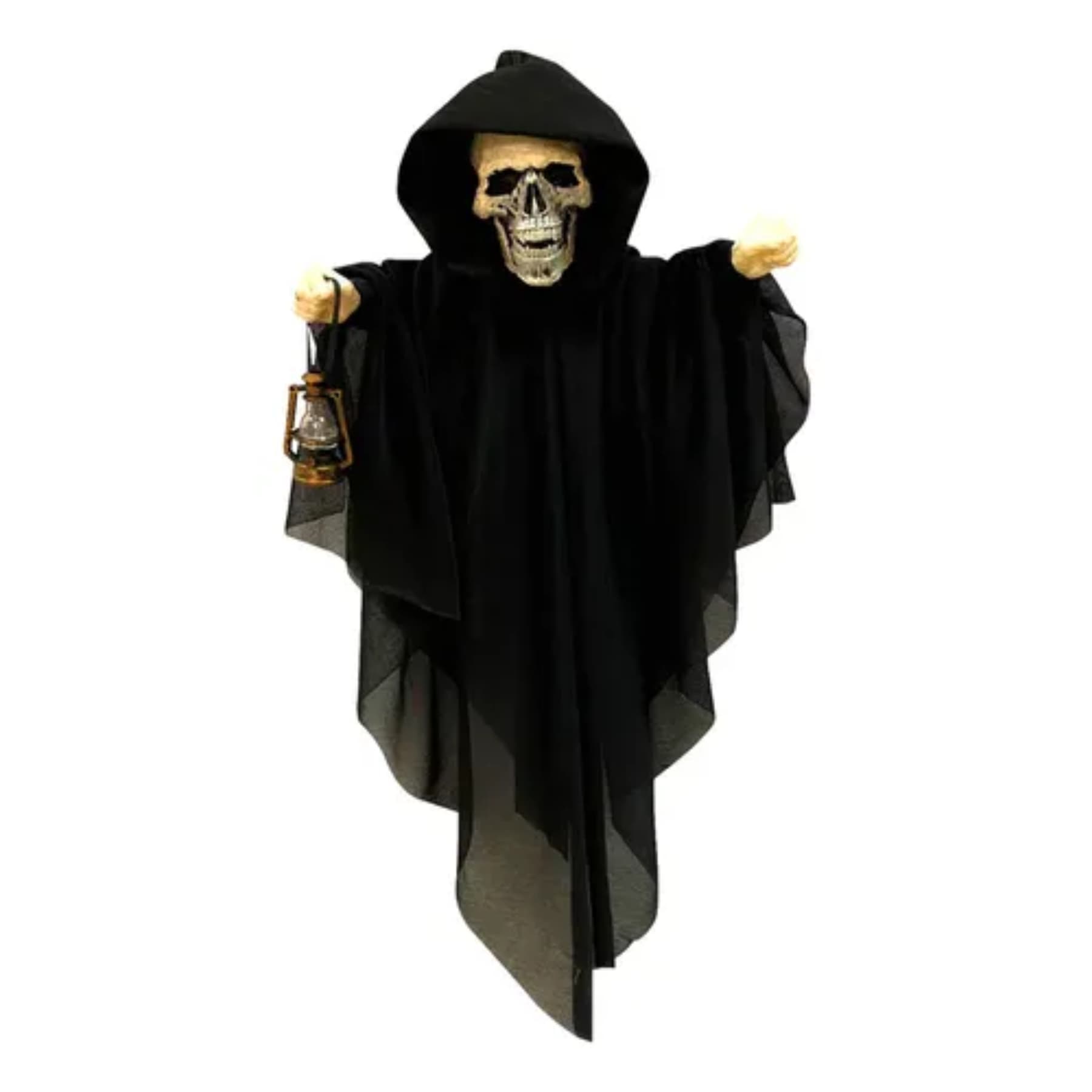 El Muñeco Muerte Colgante es una decoración clásica de Halloween que representa a la Parca o la Muerte. Generalmente está elaborado en materiales ligeros como tela, plástico o espuma, con túnica negra rasgada, calavera y brazos móviles o colgantes. Se puede colocar suspendidos en puertas, techos, árboles o ventanas, generando un ambiente terrorífico y llamativo para fiestas y decoraciones temáticas.